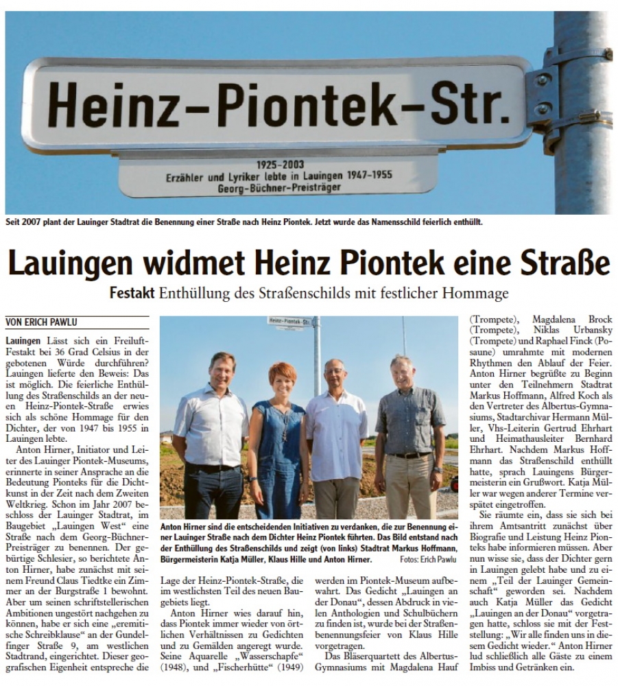 Mit der Enthüllung des Straßennamens in einem Neubaugebiet Lauingens wird dem Dichter Heinz Piontek eine weitere Anerkennung zuteil. Die Stadt würdigt den anerkannten Lyriker und Erzähler nach einstimmigenen Beschluss im Stadtrat mit der Bennennung einer Straße. Piontek wohnte mehrere Jahre in der Donaustadt und begann hier seine schriftstellerische Laufbahn.